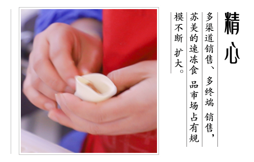 公司產(chǎn)品涵蓋速凍水餃(含手工水餃和大餡水餃)、速凍餛飩、速凍湯圓等三個系列、30多個花色品種,主要產(chǎn)品在華東、華西、華北的市場占有率達18%以上,其中蘇美的芹菜豬肉水餃、韭菜雞蛋水餃以其獨特的口感,大受消費者好評,成為了新晉的網(wǎng)紅美食.